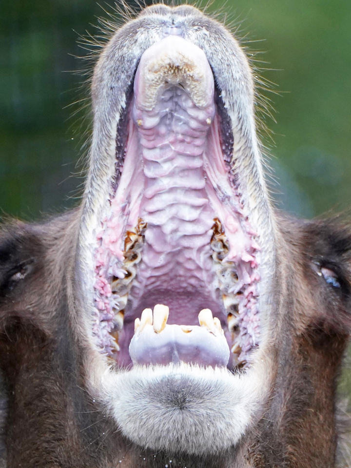 ラクダの口の中には「頑丈な歯」と「弾力性にとんだ無数のヒダ」があります。この「弾力性にとんだ無数のヒダ」とは口腔乳頭(こうくうにゅうとう)という円錐形の突起で、食べ物を一方向に整えるように作用します。ラクダによっては、この乳頭が、ほほの内側や舌にもある種もいます。